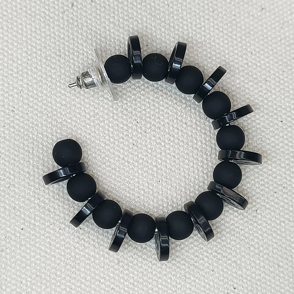 Brinco de Argola Médio com botões de camisaria preto brilho e miçangas em Preto fosco – Estúdio Marcha