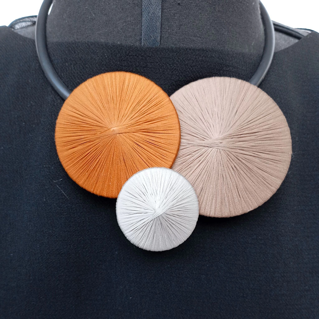 Cordão pescoço de borracha com fecho ímã, peças redondas sobrepostas alinhavadas, sendo a maior com 8 cm de diâmetro. Acabamento em couro legítimo.