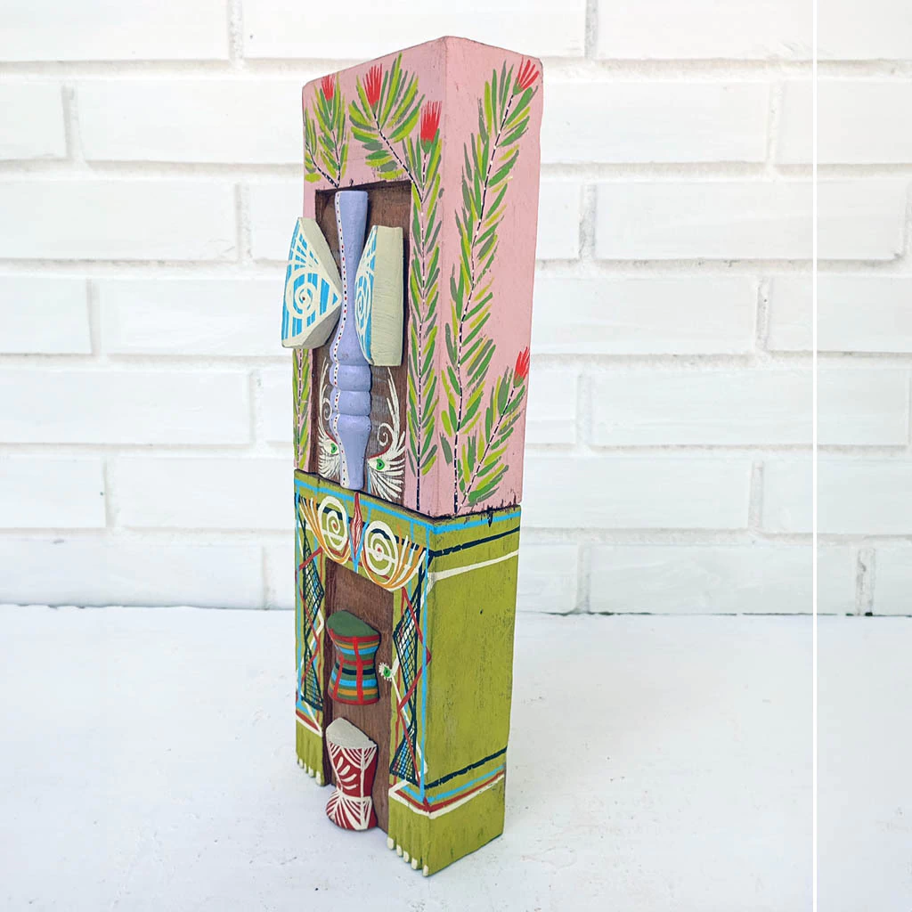 Sculptor Célio Freire de Sousa was born and lives in Fortaleza (CE). Influenced as a boy by the work of the naïve painter Chico da Silva, and as an adult by the artist João Callado, who worked with leather, he decided to follow this path. He produces sculptures in dead wood, reused or recycled, where he creates, with a theme focused on nature, heads, faces and totems, among others.
