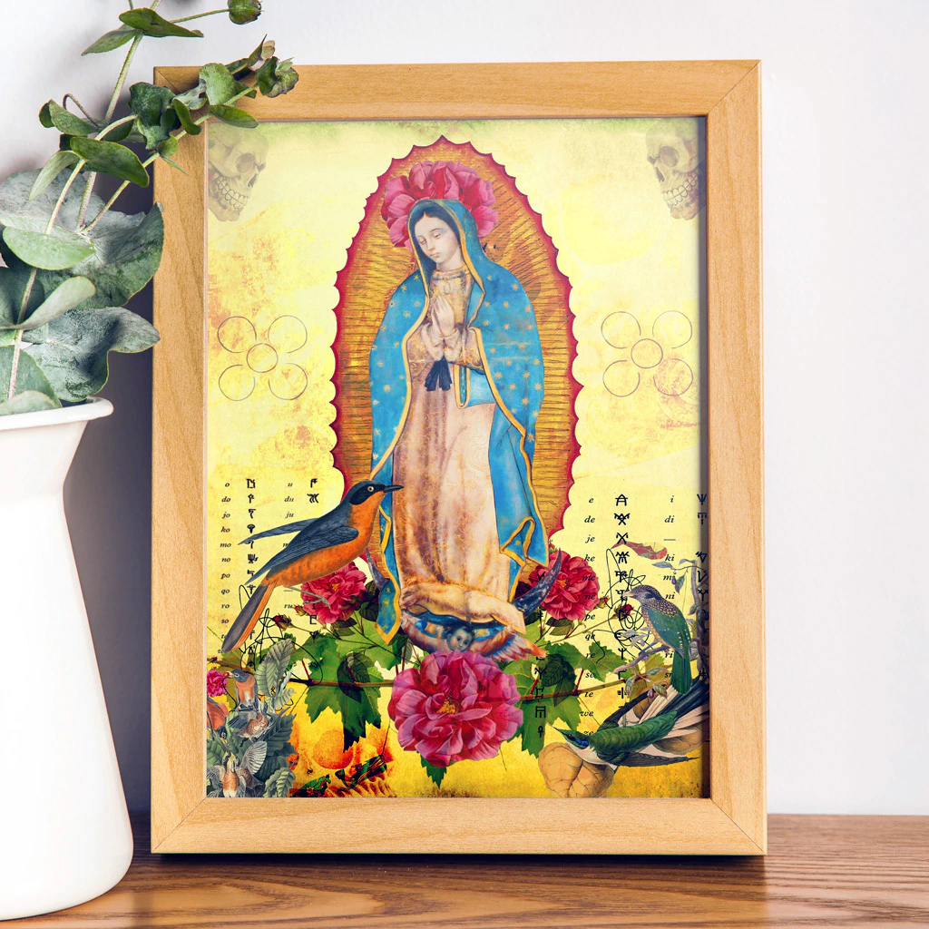 Nossa Senhora de Guadalupe é uma aparição mariana da Igreja Católica de origem mexicana. A Virgem de Guadalupe, cujo principal centro de culto é a Basílica de Guadalupe, no monte Tepeyac, ao norte da Cidade do México. No ano de 1531, a virgem apareceu quatro vezes para o indígena chichimeca Juan Diego Cuauhtlatoatzin, que pertencia à baixa casta dos Astecas. A santa pediu a Juan Diego que contasse ao bispo do México, Juan de Zumárraga, de seu desejo de que fosse erguido para ela um templo. Mas Zumárraga não acreditou em Juan Diego até que ele voltou à sua presença, após a quarta aparição da virgem, com sua bolsa de trabalho cheia de flores que cortou no alto do monte, a pedido da santa. Ao abrir a bolsa, as flores caíram aos pés do bispo e no tecido estava gravada a imagem da Virgem de Guadalupe, com traços mestiços e pele escura. Essa imagem é reproduzida na colagem, inclusive as estrelas do manto que reproduzem o céu da manhã de 12 de dezembro de 1531, quando ocorreu a última aparição e era o solstício de inverno, importante data para a cultura Asteca. Os demais elementos, das caveiras às flores e aves, fazem referência a região de Tepeyac e à cultura mexicana. A veneração à santa transcende os limites da religião, transformando-a em um símbolo nacional. Juan Diego, cinco séculos depois, se tornou o primeiro santo indígena das Américas (canonizado em 2002).