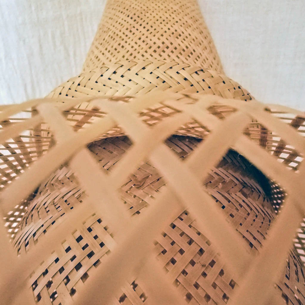 Luminária com um complexo e habilidoso trançado de Arum desenvolvida a partir da troca de saberes entre o designer Sérgio Matos e o Artesão José Garcia, São Gabriel da Cachoeira / Amazônia.