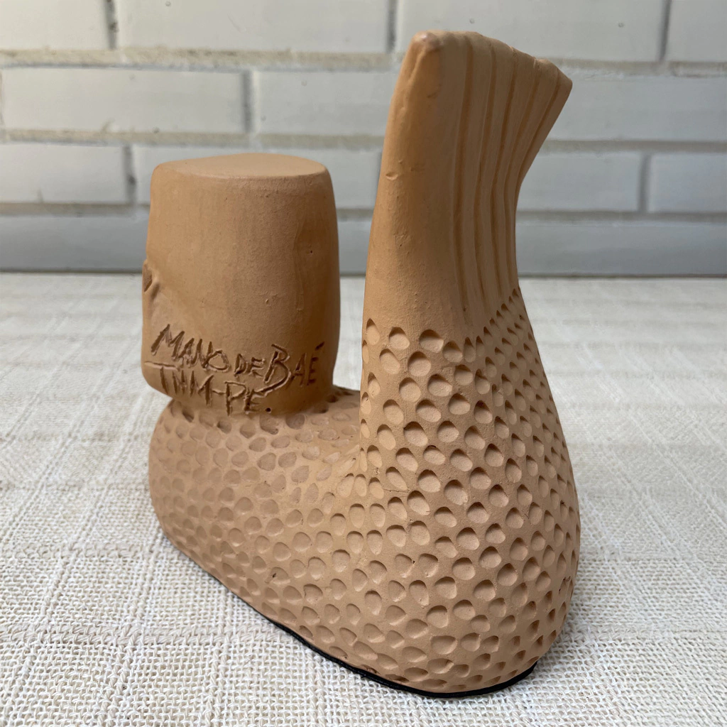 Evilásio Leão Machado, known as Mano de Baé, is from Tracunhaém (PE), where he lives and produces his art. Son of Mestre Baé, he is a musician and sculptor; uses clay to create characteristic human figures, with a quadrangular-shaped head and body. Couples and mermaids are the best known. Its pieces circulate in sophisticated environments, stores and galleries and represent the recent production of the city, famous for its clay crafts.